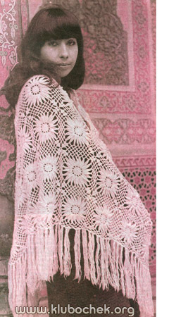 У готовой шали наружный край обвязывают столбиками без накида и привязывают бахрому.