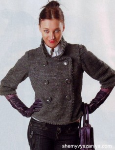 Вам потребуется: пряжа «Пехорка - Сельский мотив» (50% шерсть, 50% акрил, 400 м/100 г) - 450 г темно - серой, спицы № 4,6 пуговиц диаметром 3,5 см, крючок для сборки.