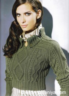 СПИНКА: Набрать на спицы № 4 82 (90) п. и вязать 6 см резинкой, при этом в последнем изн. ряду на средних 50 п. равномерно прибавить 19 п. = 101 (109) п. Затем продолжить вязание на спицах № 4,5 след. образом: кром. п., 15 (19) п. резинкой, 69 п. узором «косы и ромбы», 15 (19) п. резинкой (начиная с 2 изн. п.), кром. п. Прибавить с обеих сторон в каждом 4-м р. 6 х 1 п. = 113 (121) п. Прибавляемые петли по ходу работы включать в резинку. На высоте 19,5 см для регланных скосов убавить с обеих сторон по 2 п., затем в каждом 2-м р. 8 х 2 п. и 4 х 1 п. На высоте 28,5 см = 64 р. оставшиеся 69 (77) п. закрыть.