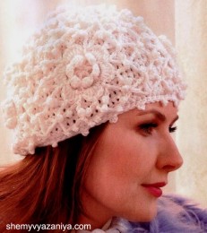 Сначала выполните нижнюю деталь плотным узором. В цепочку из 5 ВП свяжите 6 СБН. Далее свяжите СБН круг диаметром 15 см, выполняя по 6 прибавок в каждом ряду, распределяя их равномерно по контуру. Продолжите работу С1Н без прибавок до общей высоты колпачка 13,5 см. Для верхней ажурной детали шапочки свяжите 4 розочки по схеме 1 и соедините их между собой 8 кольцо в процессе выполнения последнего ряда с помощью зацепов в арочки из ВП. Для донышка свяжите одну розочку по схеме 34, увеличив ее на 1 ряд цепочек с «пико», и присоедините к ней ободок из розочек.[cut]