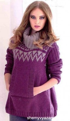 Сборка деталей туники: Спинку и переднюю часть увлажнить, расправить по выкройке и оставить до высыхания. Выполнить плечевые швы. Серо-розовой пряжей по краю горловины поднять на круговые спицы № 4,5 64 п. Вязать по кругу резинкой 1/2 (попеременно 1 ЛП, 2 ИП). На высоте 3 см перейти на спицы № 5 и в каждом 2-м рубчике резинки прибавить 1 п. Еще через 3 см в каждом пропущенном рубчике резинки прибавить по 1 п. Далее вязать резинкой 2/2. На высоте воротника 22 см все петли закрыть по рисунку. По краям кармана на спицы № 5 набрать по 40 п. и вязать следующим образом: (= изн. ряд) кром. п., = 2 ИП, 2 ЛП *, повторять от 2 ИП, кром. п. Через 4 см все петли закрыть по рисунку. Пришить короткие края резинок кармана с внутренней стороны. Из боковых сторон передней части, исключая короткие стороны резинки по нижнему краю, поднять пряжей ягодного оттенка 76 (78) п. На спицах № 5 вязать лиц. гладью, выполняя жаккардовый узор; провязать 1-10-йряды по схеме, затем 8-1-й ряды (=18 р.), при этом 1-3 петли от внешнего края провязывать платочной вязкой: 3 (5) п. платочной вязки, 72 п. лиц. гладью жаккардовым узором по схеме, кром. п. Через 18 р. жаккардового узора пришить край к соответствующей стороне спинки швом «петля в петлю- пряжей ягодного оттенка. Выполнить швы рукавов, при этом верхние 4 см оставить открытыми. Вшить рукава в проймы.