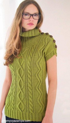 Перед: Набрать петли и вязать, как спинку, но на высоте 60 (62) см от начала закрыть 22 центральные п. для горловины, затем с обеих сторон от них 1 раз по 3 п., 1 раз по 2 п. и 6 раз по 1 п. в каждом 2-м р. Плечевой скос слева выполнить уже на высоте рукава 18 см от начала, в справа выполнить плечевой скос, как на спинке, на высоте 19 см. [cut]